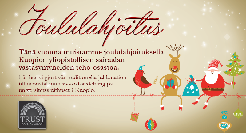 Trust Kapitalin joululahjoituksella tuetaan tänä vuonna Kuopion yliopistollisen sairaalan vastasyntyneiden teho-osaston laitehankintoja. Lisäksi vanhempia lapsipotilaista muistetaan lasten veri- ja syöpätautien osastolle toimitettavalla lelulahjoituksella.
